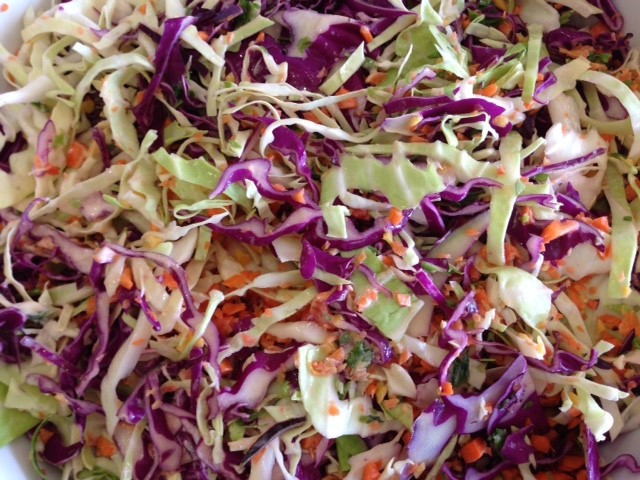 Most cole slaw is overly creamy for my tastes but the following recipe is not. Full of fresh crisp shredded green and red cabbage (the main ingredients so buy the freshest available), carrots, green pepper, and scallions with a light mayo sauce, the cole slaw a prefect summer accompaniment to any meal. And, it’s so simple to make with a cuisinart.
