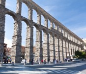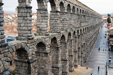 The Aqueduct of Segovia is one of the most impressive and best preserved aqueducts left in the world. Built nearly 2,000 years ago by the Romans after they conquered the city, the aqueduct was built to transport water from a river about 11 miles (17 kilometers) away through channels that led to the granite block, kilometer long aqueduct.
