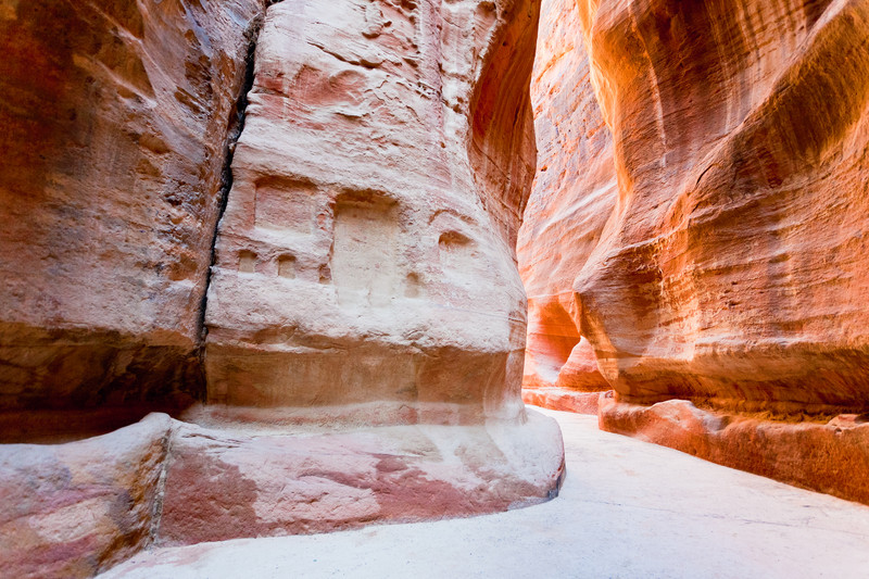 To enter the ruins, visitors have to walk (or be carried on a donkey or horse-drawn carriage) a kilometer long narrow meandering gorge passage called a “siq” that has soaring 250 foot high walls on either side.