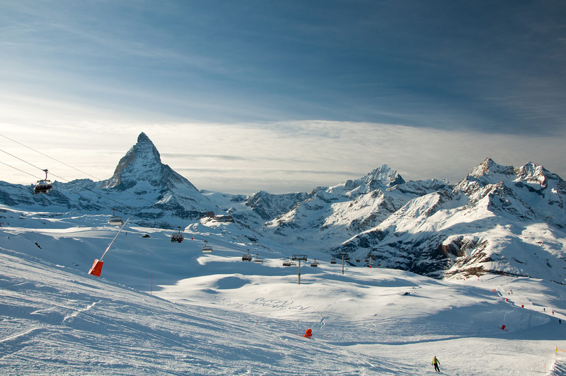 Zermatt ski areas offer 350 kilometers (210 miles) of pistes for skiers in a condensed area. One of the great advantages of Zermatt is that a skier can go to any slope and even ski in Italy starting from the center of town. The basic information to know is that there are five easily accessible peaks in Zermatt: