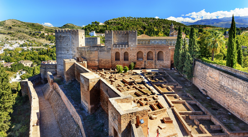 Alhambra is a complex of buildings built on a steep rock formation visible for miles.