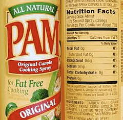 In fact, a 6 ounce can of PAM original cooking spray is primarily made up on canola oil – 170 grams. Each gram of canola oil equals one gram of fat which means there are 170 grams of fat in that 6 ounce can whose label says there is no fat per serving. How do they get away with it? The FDA guidelines say that any food that contains less than a half gram of fat can be called “fat free.” Because the 6 ounce can of spray specifies a serving as a 1/4 second spray or a 1/4 gram serving, the manufacturer – ConAgra Foods – is permitted to label the spray as fat free when, in fact, it isn’t. The bottom line: don’t rely on labels…read the ingredients list.