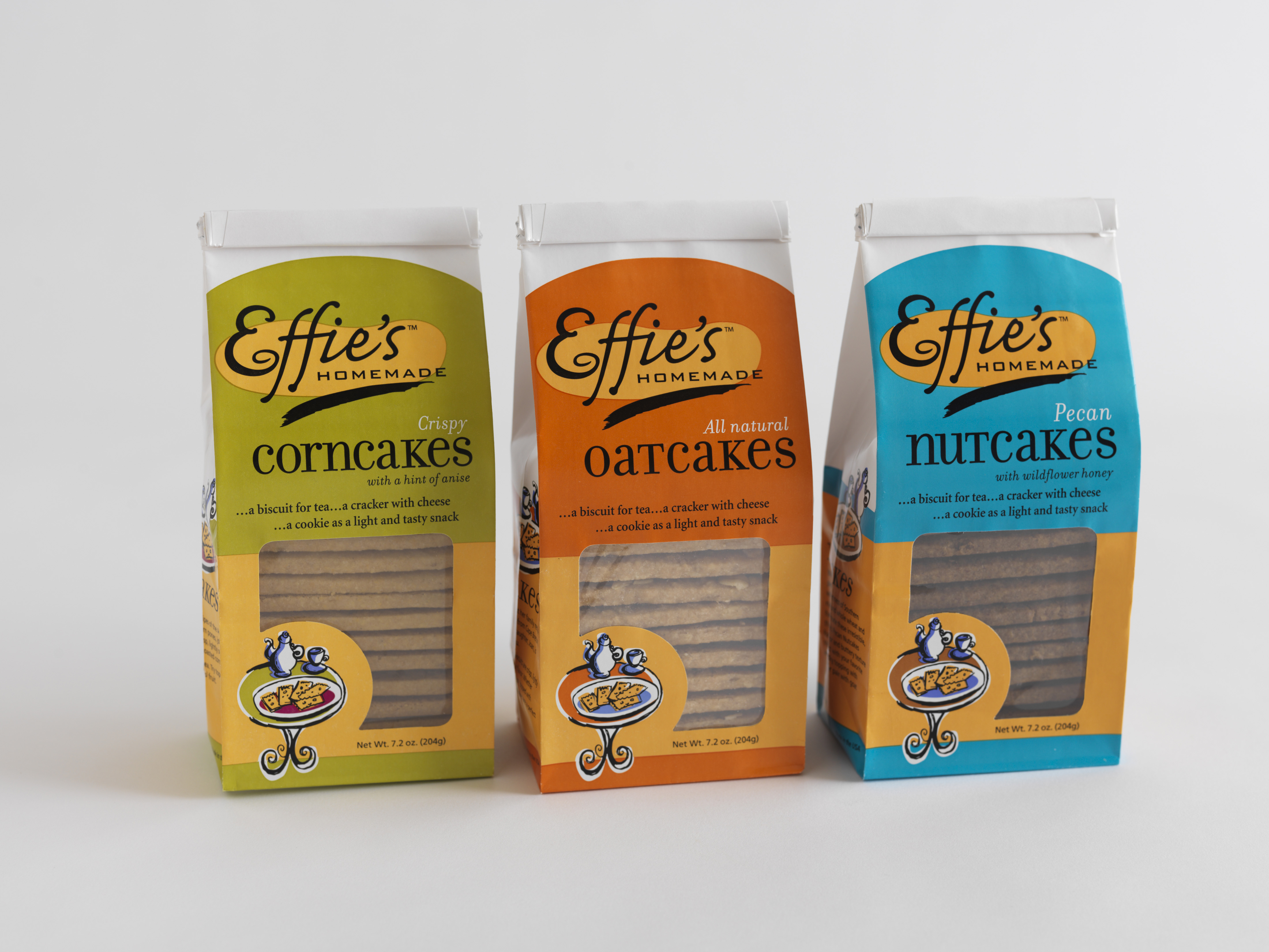 Effie’s Homemade products are available throughout the United States in more than 750 gourmet shops, cheese stores, and many Whole Foods and Fresh Market stores. To find the nearest store, refer to the company website that provides a list of stores by state or order the cakes on-line, also through the company website listed below. Each 7.2 ounce bag sells for approximately $6.
