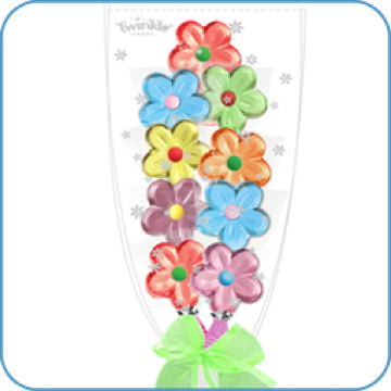 A Twinkle Pop is a beautiful small lollipop that comes in a variety of colors and shapes. The pop is distinguishable from other lollipops by an extra long hollow plastic stick that not only makes the pop easy to hold but fun to sway back and forth, as well. Holding a Twinkle Pop feels like you’re holding a long-stem tulip only better because it’s edible.