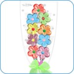 Each lollipop is about a third of an ounce (9 grams) and comes in colors of the rainbow: yellow, orange, red, purple, pink, green and blue although there are also two-tone pops that have two colors. These confections come in a wide variety of shapes: tulips, daisies, sunflowers, roses, stars, hearts, sports balls, butterflies, ribbons, teddy bears, angels, aquatic and animal mixes, and more. The lollipops are very inexpensive – from 30 to 50 cents each, depending on the quantity purchased and where the pops are purchased. Individually wrapped in a clear plastic cover to show off the eye appeal of each Twinkle Pop, these novelty candy pops taste as good as they look.