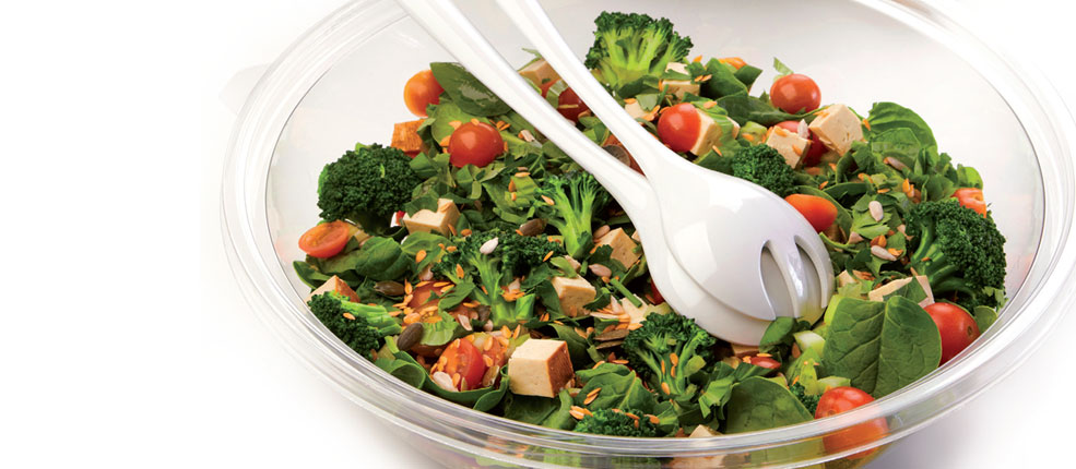 Each restaurant is ultra clean with the decor done in either earth tones or a glistening green and white color scheme. There are three parts to each restaurant: the seating area, the self-serve refrigerated section containing drinks (fresh juices!) and pre-made foods (soups, wraps, salads, yogurt, desserts) and the made-to-order salad line. Behind fingerprint-free clear glass, are 42 immaculate containers of toppings that include meats, cheeses (freshly shaved parmesan, mozzarella), beans, pasta, vegetables, fresh and dried fruits, nuts, and croutons.