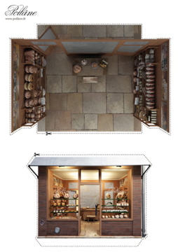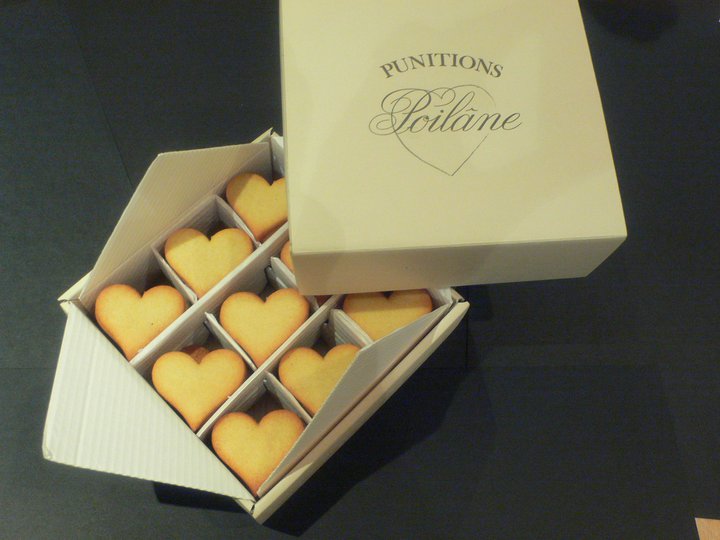 Poiláne looks rather plain from the outside with muted wheat colored exterior walls. Large square windows filled with bags of butter cookies and free form apple tarts enclose a front door that opens into a very plain grey tiled floor. On the left side of the interior are rows and rows of large circular loaves of bread with a “P” imprinted on the top of each loaf, “petite pain” (small breads with raisins, walnuts, or plain), and breakfast breads (croissants, pain au chocolate and brioche).