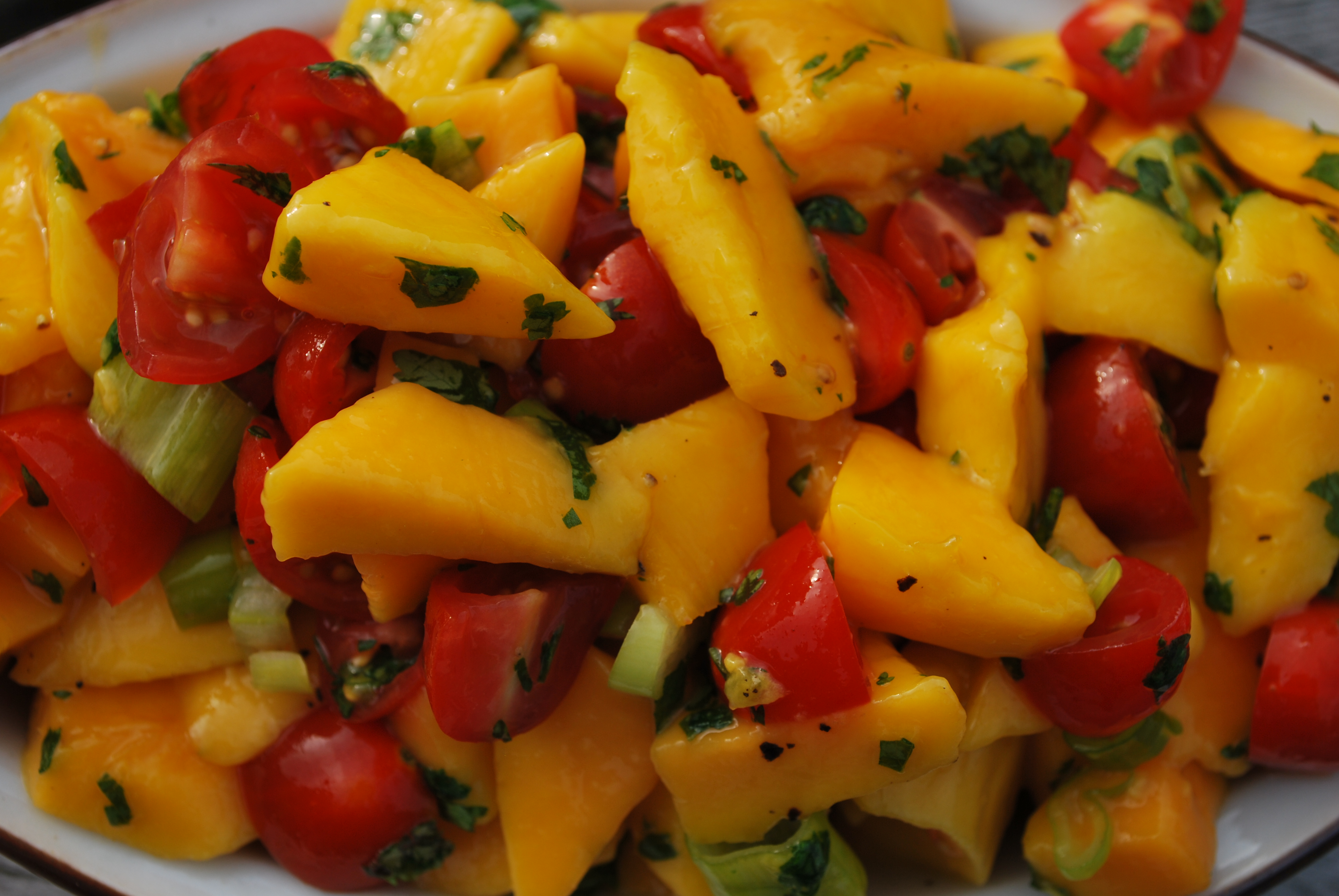 - In a large mixing bowl, combine the mangos,tomatoes, scallion, and red onion (if using). Gently stir to blend ingredients.