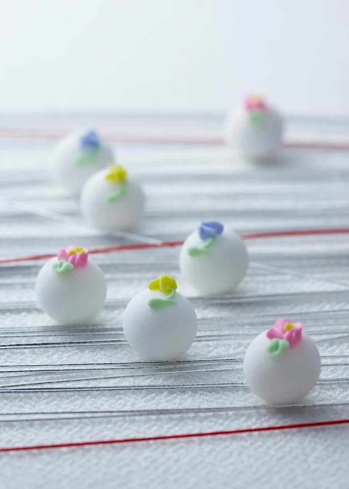 Finely powdered sugar in pastel yellow and paper tubes of stick sugar are also available. And, for traditionalists, there are white cubes (sucre carré) or balls (sucre rond) with a colorful bouquet of blooms in pink, yellow, and purple. Both come in sizes small and large.