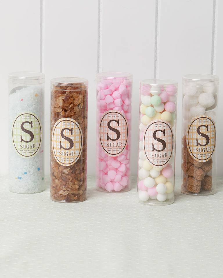 The decorative sugars come in a variety of shapes: cubes, balls, squares, crystals, flowers, hearts, elephants, dolphins, and angel wings – and colors: pastel pinks, greens, blues, purples, yellows and a blend of rainbow sugar crystals. There are also the standard square cubes in white or light brown and balls of brown sugar.