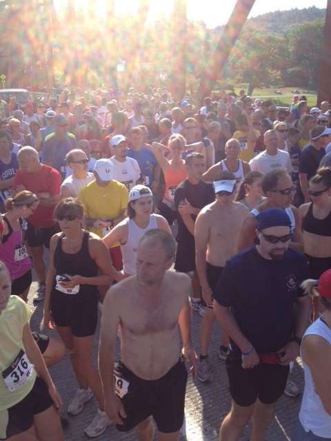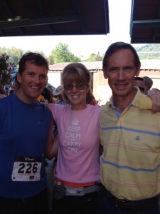 The day before the race, Mark e-mailed me and told me the temperature was expected to reach 85 degrees – but when I looked on http://www.weather.com, the temperature at start time was predicted to be in the mid to high 70’s – less than ideal but not awful. I thought about withdrawing but didn’t want to back out so we all met at 6:45 am on Saturday morning and drove the 25 miles to North Creek. Upon arrival, we got our race packs and boarded the train that would take the runners and spectators to the starting point – 8.4 miles away- before racing the train back. With only 321 runners, there was plenty of space on the train. We arrived at the starting point – a big red bridge – and my husband took a picture of us (top photo) before the start. We all looked really happy but we didn’t stay happy long. At left is a picture of Mark, myself, and my husband before the race.