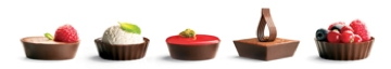 Chocolate Cups: Made of dark chocolate, the plain cups come in four shapes: square, round, round fluted, and oval. Each cup is about 2 inches wide and 5/8 of an inch high. Perfect for pastry cream, mousse, or puddings, the chocolate cups come in a 2.4 pound box (168 pieces) for $52.99. Just fill, chill and serve.