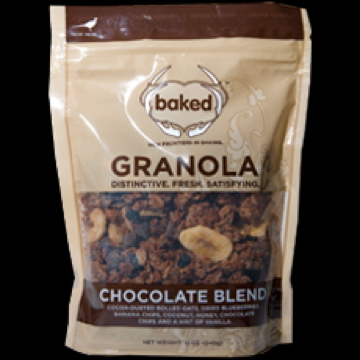 Chocolate Blend: A chocolate lovers breakfast dream made with whole rolled oats, honey, canola oil, brown sugar, chocolate chips, dried blueberries with sugar, bananas, coconut, cocoa powder and vanilla.
