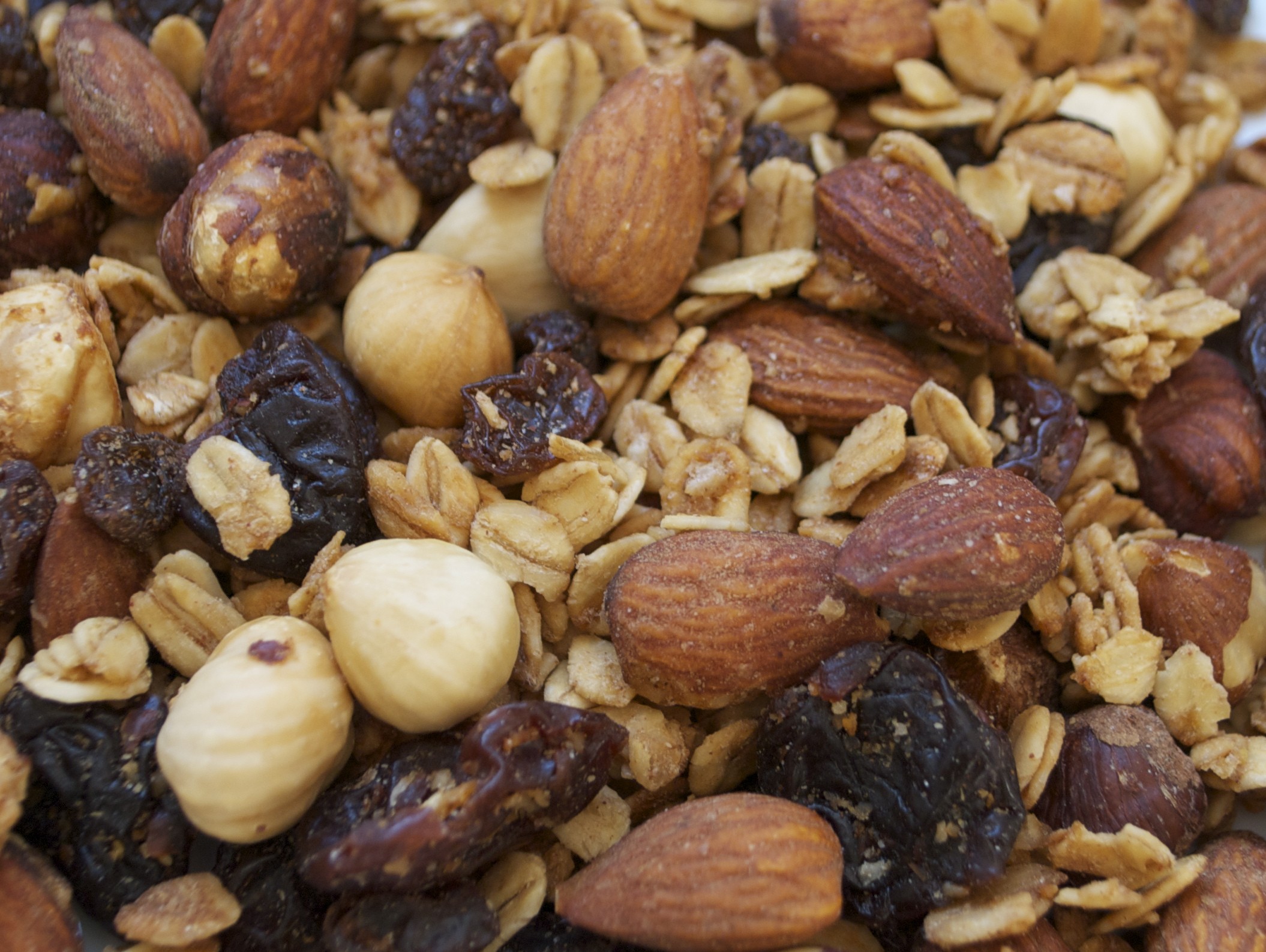 House Blend: The House Blend is made with whole rolled oats, almonds, hazelnuts, cherries with sugar, organic golden raisins, honey, brown sugar, canola oil, vanilla, and cinnamon. A crunchy blend of oats, nuts, and dried fruit with a hint of cinnamon, as pictured above.