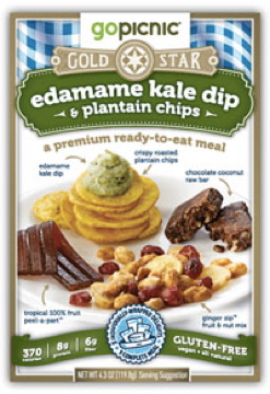 Edamame Kale Dip and Plantain Chips: A gluten-free vegan balanced meal that contains Go Picnic Garden Edamame Kale Dip with hints of ginger and sesame, Sweet Perry Orchards Crispy Roasted Plantain Chips, Sweet Perry Orchards Ginger Zip Fruit and Nut Mix, Sweet Perry Orchards Tropical 100% Fruit Strip, and a Raw Revolution chocolate coconut raw bar for dessert.Contains 370 calories with 8 grams of protein, 19 grams of fat, and 6 grams of fiber.
