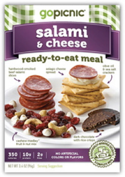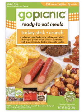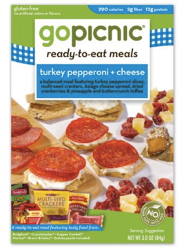 Each Go Picnic boxed meal weighs between 2.8 ounces and 6.2 ounces and can be purchased on-line directly through the company’s website (listed below) in a variety of options. The meals can be purchased individually for $3-$6, depending on the choice or variety packs of 6 boxes (i.e. gluten-free, super variety) can be purchased for $26.99 ($4.50 per box) or 12 packs (i.e. gluten-free, meat lovers, best-selling, etc) for $49.99 ($4.15 per box). The boxes can also be purchased through Amazon for about $24 for 6 boxes ($4 per box) with shipping included for Prime members or through www.drugstore.com for about $25 for 6 boxes ($4.15 per box) with free shipping for all orders over $25.