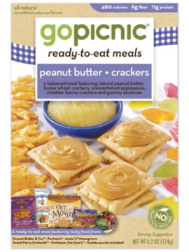 Peanut Butter and Crackers: This all natural boxed meal contains Peanut Butter and Company Smooth Operator Natural Peanut Butter, Partners Get Movin’ Honey Wheat Crackers, Sweet Perry Orchards Unsweetened Applesauce, Annie’s Homegrown Cheddar Bunnies, and Professor Zim Zam’s All-Natural Jelly Jets. Contains 460 calories with 11 grams of protein, 20 grams of fat, and 6 grams of fiber.