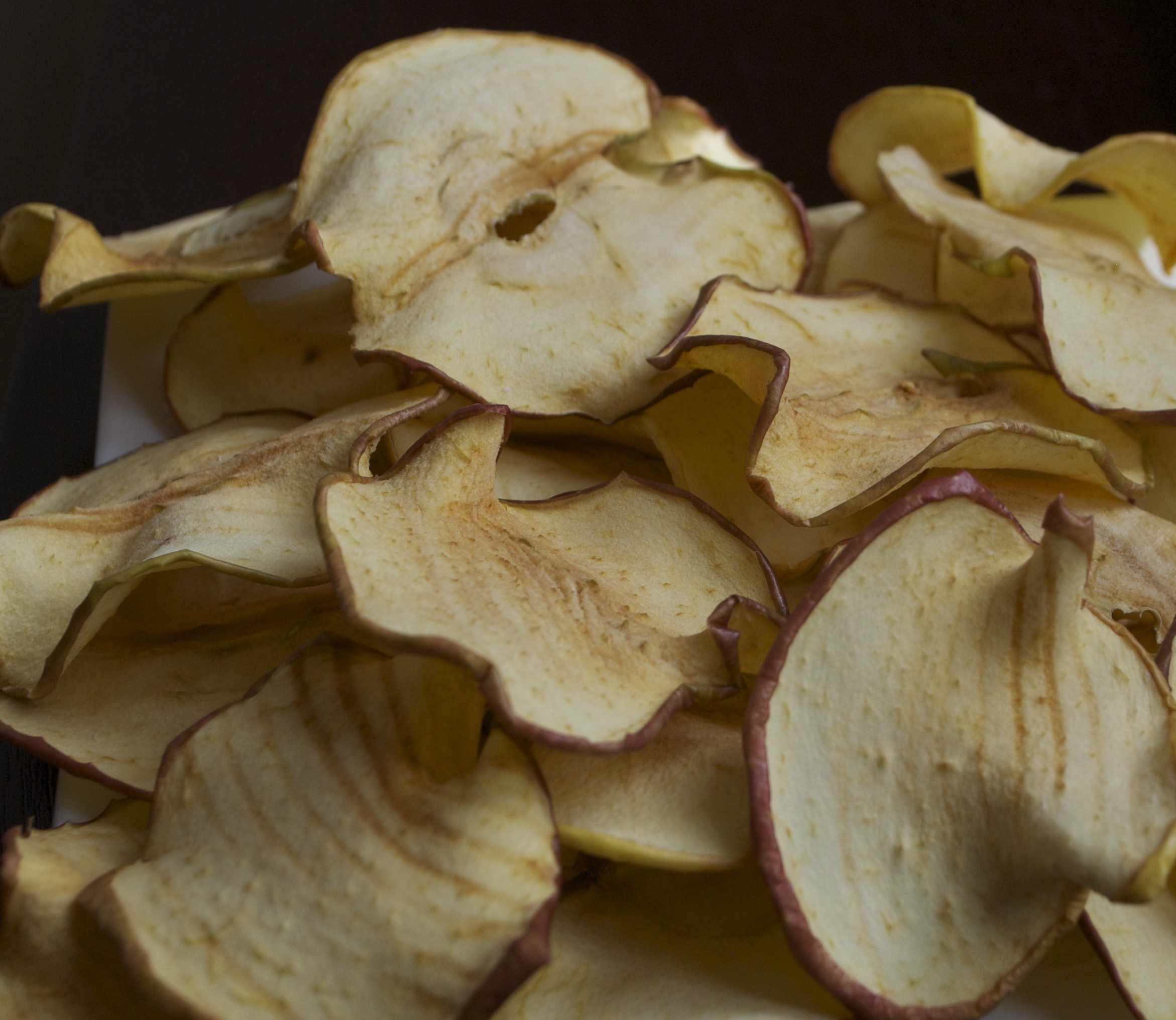 Nine trays may seem like a lot but 6 average-sized apples (3.5 – 3.7 pounds) sliced thinly with a mandoline food slicer (a $30 tool that slices fruits and vegetables very thin; available at Amazon) will fill 9 trays and provide approximately 8 ounces of dried fruit – enough to fill 3 quart sized Ziploc bags. Use a flavorful apple such as Honey Crisp (above) because the quality of the fruit matters.