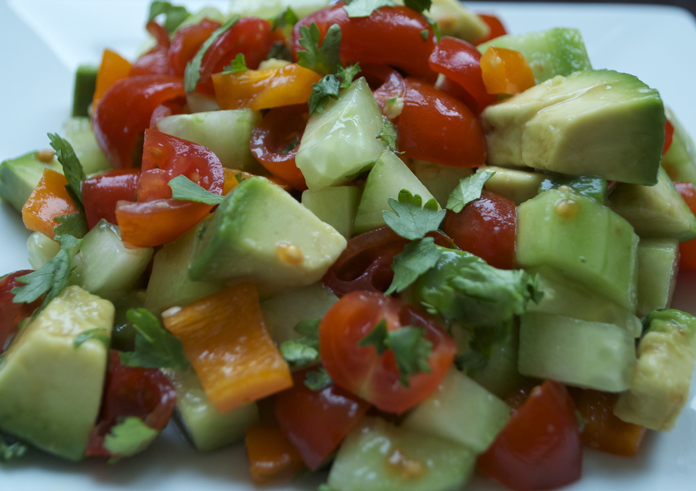 Cucumber, Tomato and Avocado Salad is a bright, colorful salad that takes less than 10 minutes to make and tastes fresh and delicious. Filled with a diced seedless cucumber, chopped sweet grape tomatoes, a minced sweet orange pepper, chopped Haas avocado, cilantro, and a dash of Pink Himalayan salt, this salad goes with nearly any main dish. The Cucumber, Tomato, and Avocado Salad is light and refreshing with ingredients that are readily available this time of year. When time is limited, this is a great salad to pull together in minutes.