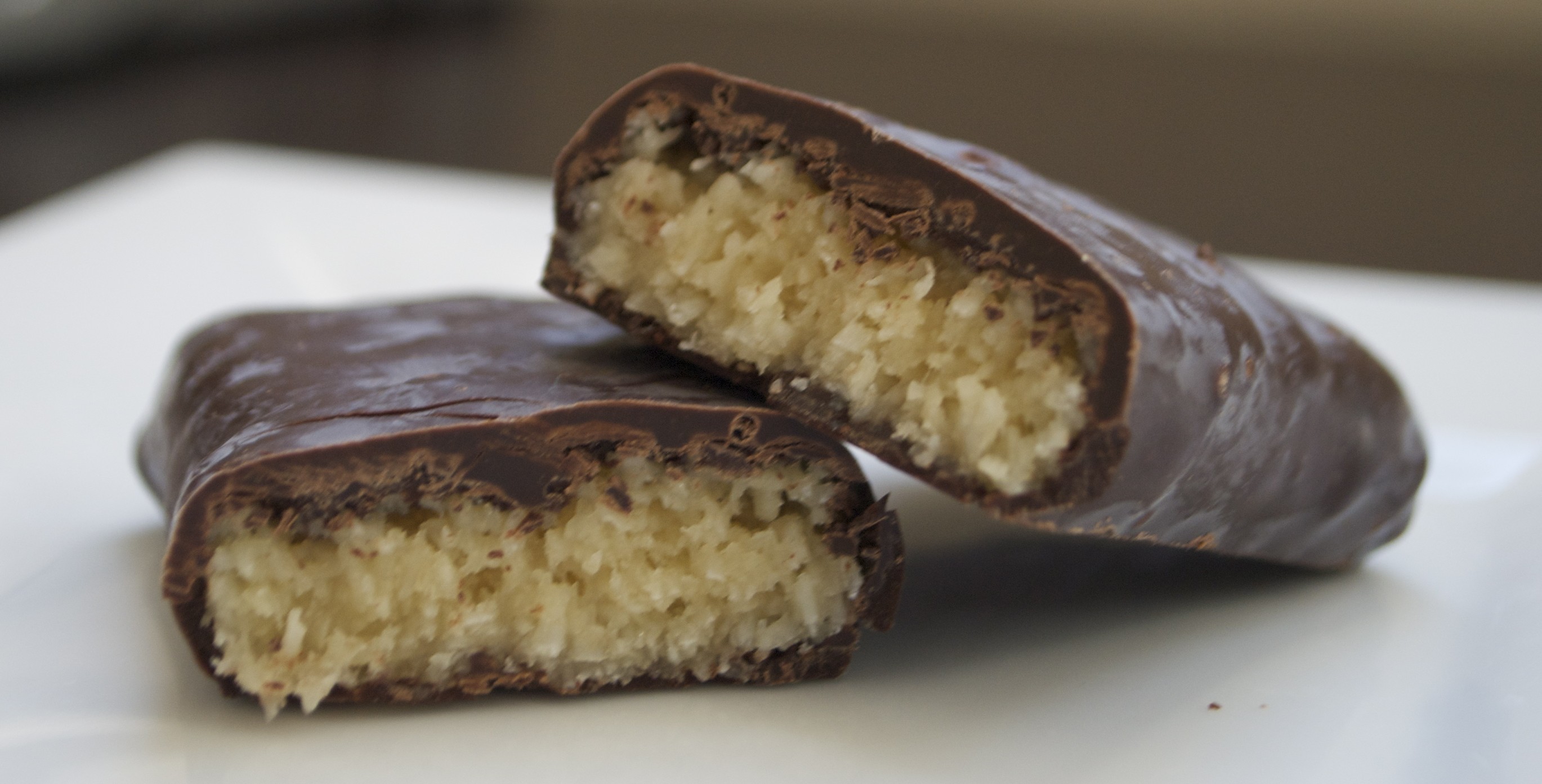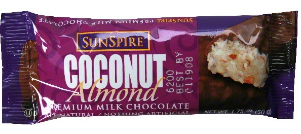 The Sunspire Coconut Bar is a dark chocolate bar filled with dried unsweetened coconut, white rice syrup and vanilla. Each bar weighs 50 grams (1.75 ounces) and contains 260 calories and contains 15 grams of fat (primarily because of the coconut). Rich, decadent, and so delicious, the Sunspire Coconut Bar is what a coconut candy bar should taste like.