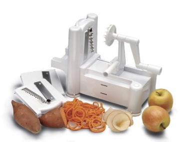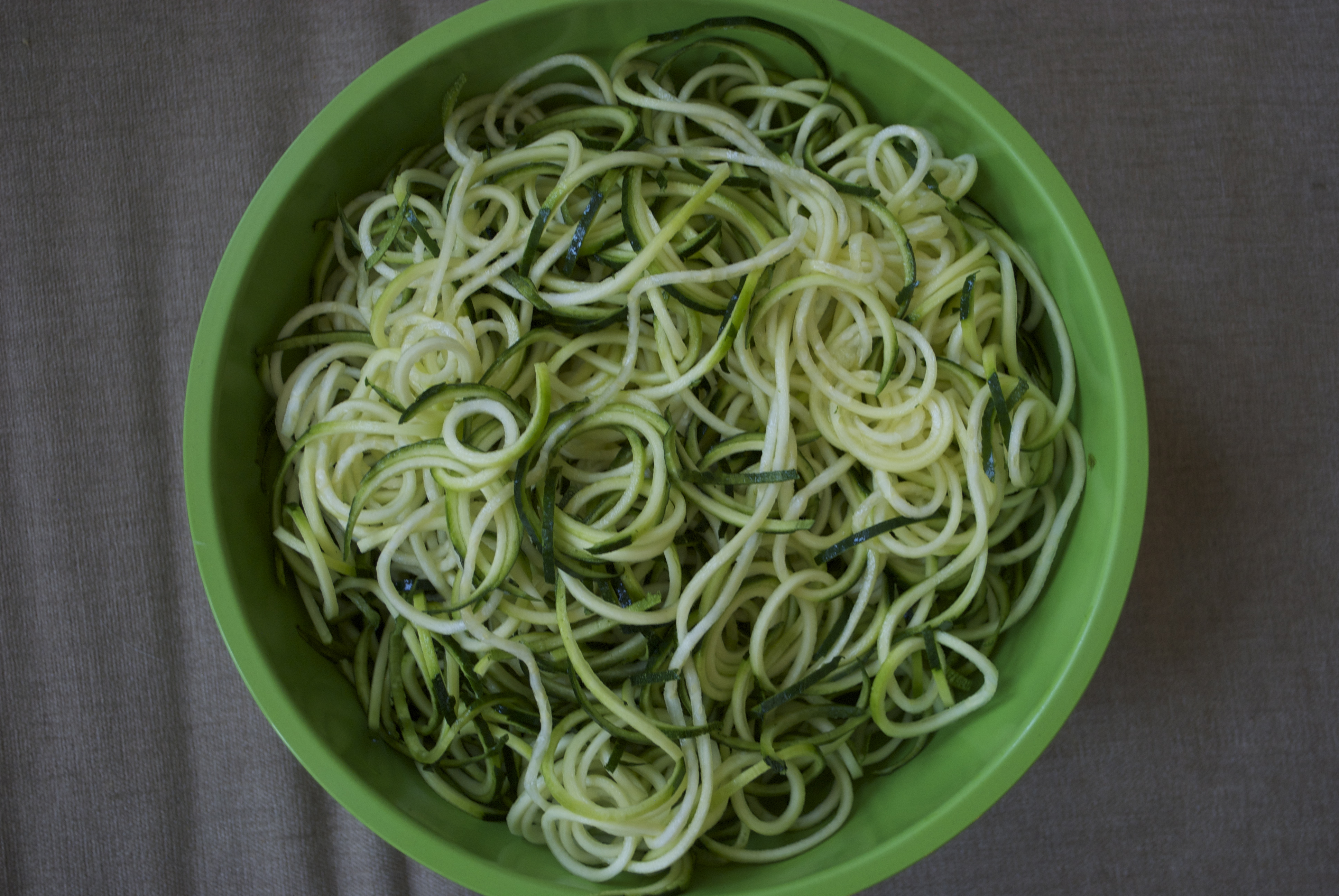 The Paderno comes with three (3) blades: the shredder, the chipper, and the slicer. For this recipe, the shredder blade is used to turn zucchini into noodles. Each zucchini is changed into a pile of noodles in less than 30 seconds.