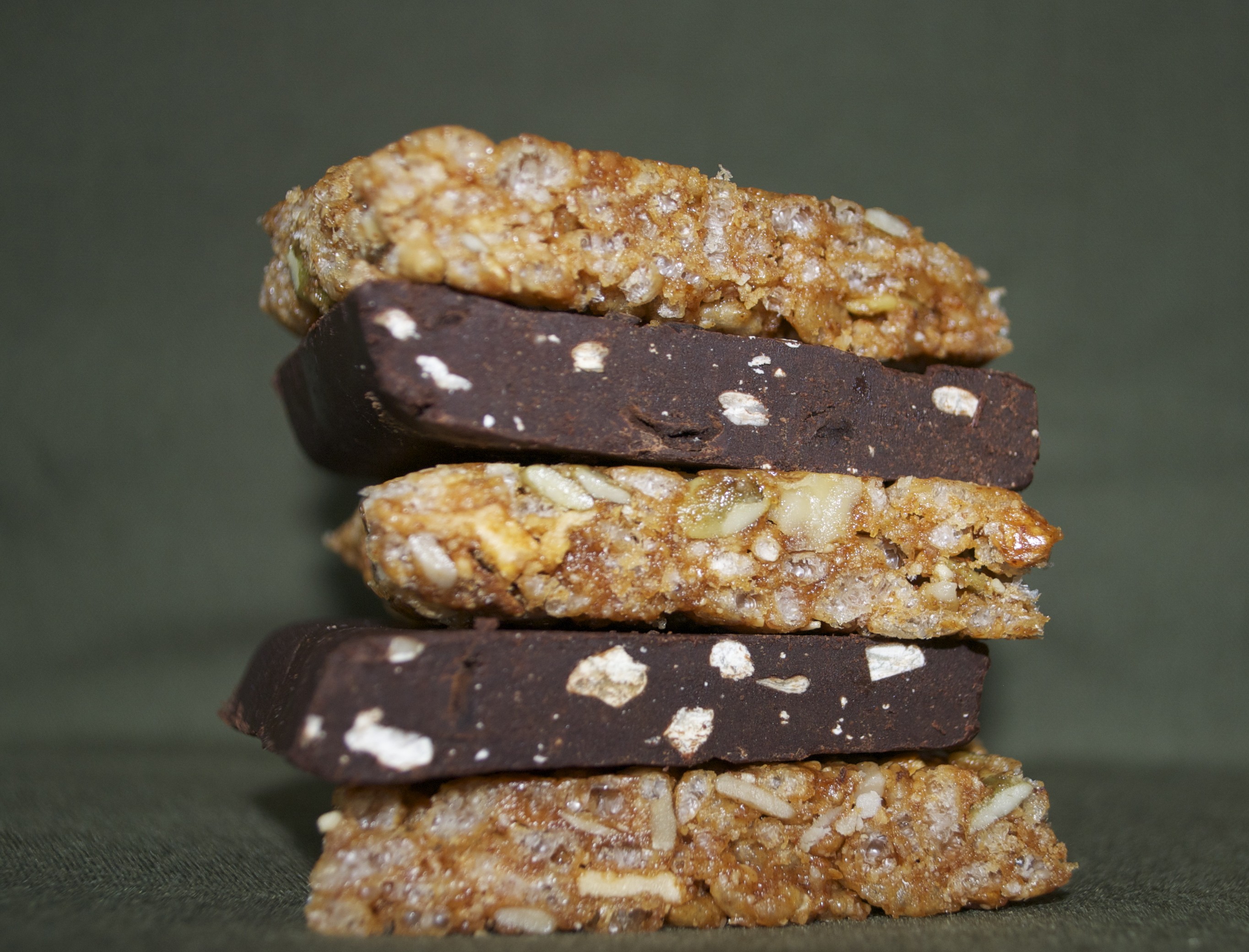 The Choco Fit Espresso Bar: Made of pure dark chocolate (99%), organic almond butter, organic raw coconut butter, organic espresso beans, organic raw sunflower seeds, organic raw pumpkin seeds, organic raw walnuts, organic raw almonds, and espresso beans.Each 2.0 ounce bar contains 260 calories, 6 grams of protein, 7 grams of fiber, 1 gram of sugar, 5 mg of sodium, and 24 grams of fat (primarily from the coconut butter, seeds, and nuts).
