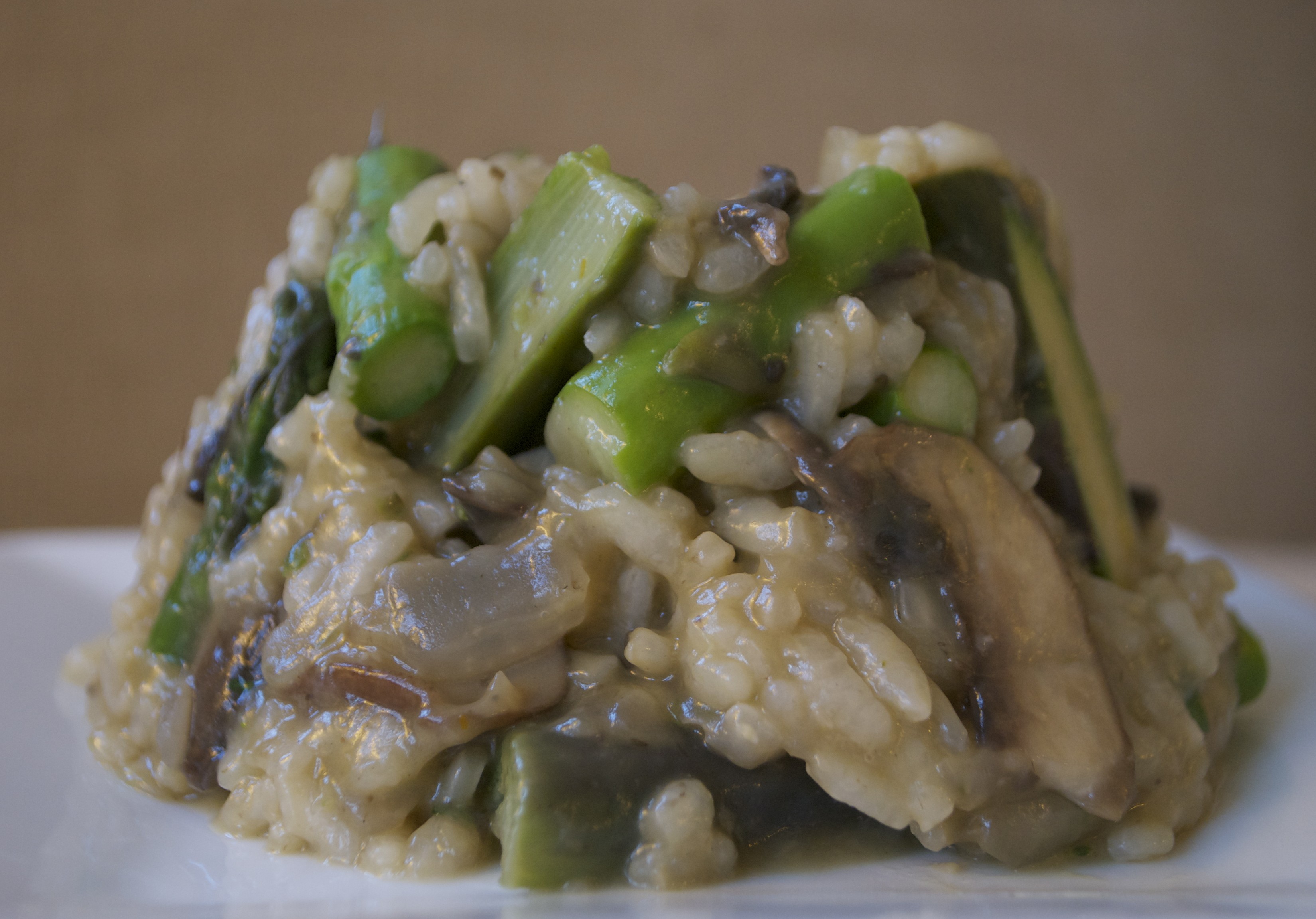 Risotto is usually thought of as a wintertime dish because of its hearty nature but during the summertime, a light risotto with asparagus and mushrooms can be a refreshing change. Skip the butter and parmesan cheese; instead rely on a bit of olive oil, dry white wine, vegetables, a small amount of mild elephant garlic and broth to give the risotto body, flavor and texture. Tender and creamy but not heavy, Vegan Risotto with Asparagus and Mushrooms is especially delicious with chopped fresh parsley and a sprinkle of Himalayan sea salt added just before serving.