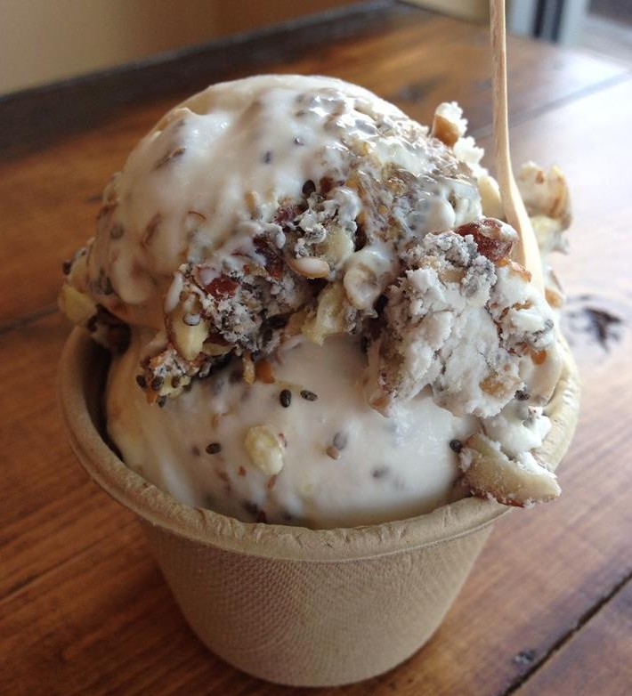 FoMu’s signature coconut ice cream is then blended with real vanilla, cocoa, strawberries, peppermint, blackberries, cardamom, lavender, peanut butter, espresso beans, cherries, nuts, avocados, bananas, maple syrup, and more to make one of the 20 flavors offered although new flavors are constantly being formulated. The nut blend base currently comes in five flavors – Carrot Cake, Grapenut Raisin, Chocolate Pudding, Chocolate Hazelnut, and PB Cookies and Cream.