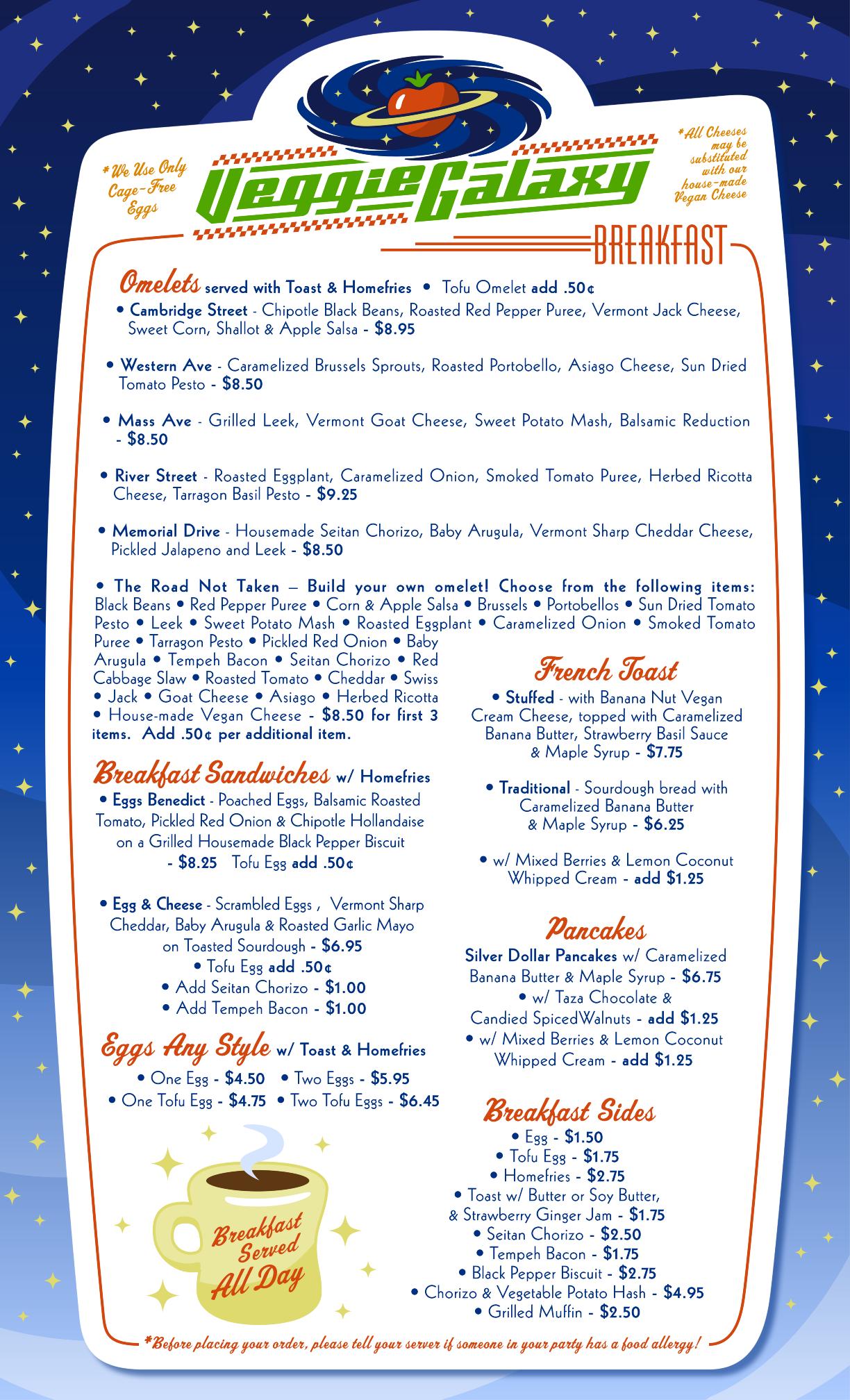 Veggie Galaxy also offers a wide assortment of muffins, sticky buns, cinnamon rolls, brownies and an assortment of cookies. Breakfast is served all day which is just what you would expect at a diner and Veggie Galaxy won’t disappoint as the menu offers all the usual fare: pancakes, omelets, breakfast sandwiches, eggs any style, home fries, potato hash, biscuits and more.