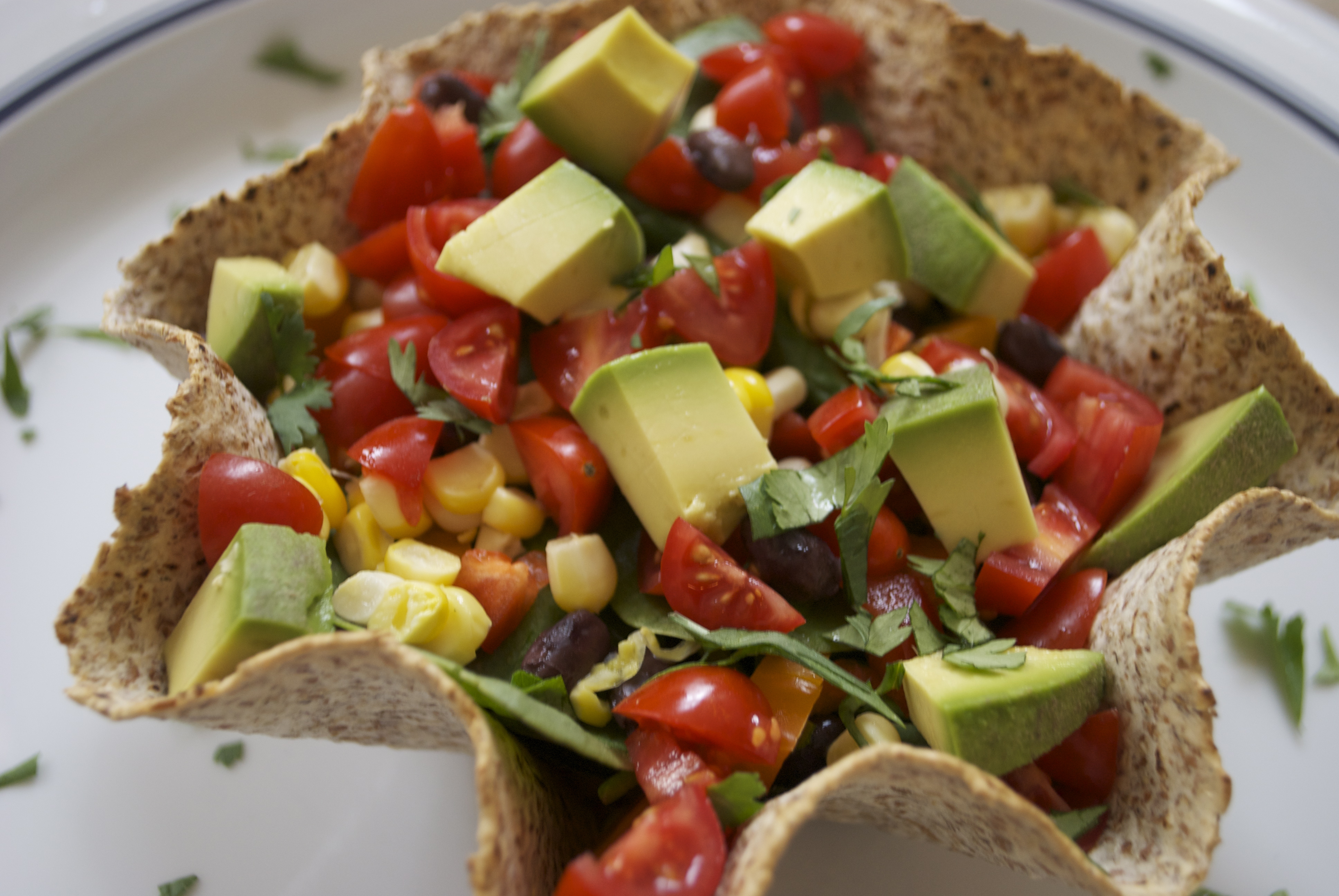 Hearty and delicious, Ezekiel 4:9 Sprouted Grain Tortillas are perfect to make taco bowls. Simply place a defrosted tortilla (as these tortillas are often in the frozen food natural food section in grocery stores) into the microwave oven for 10-12 seconds and immediately place the tortilla into the non-stock metal pan (no need to spray the pan as the tortilla won’t stick). The microwave process makes the tortilla pliable and easy to take on the shape of the fluted pan. Bake at 375 degrees for 10-12 minutes until lightly toasted. Remove from the oven and allow to cool slightly.