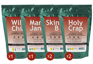 The company also sells resealable 8 ounce bags of organic hulled hemp seeds (aptly named Mary Jane) and organic chia seeds called Wild Chia. There is also a Fun Pack which contains 6 packets: two 8-ounce packets of Holy Crap, two 8-ounce packets of Skinny B, one 8-ounce packet of Mary Jane and one 8-ounce packet of Wild Chia for $49.95, shipping included.