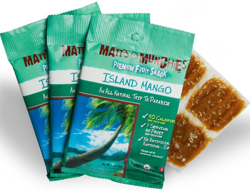 Matt’s Munchies are premium fruit snacks that come in 11 flavors: Mango, Banana, Tangy Apricot, Island Mango (organic mango puree with organic coconut flakes and organic coconut flavor concentrate), Mango Acai (organic mango puree and organic acai pulp), Apple-licious (organic mango puree, and organic apple flavor concentrate), Ginger Spice (organic mango puree, organic ginger powder and organic cinnamon powder), Apple Pie (organic banana puree and organic cinnamon powder), Raspberry Delight (organic banana puree, semi-sweet chocolate, organic chocolate flavor concentrate and organic raspberry flavor concentrate), Choco Nana (organic banana puree, semi-sweet chocolate and organic chocolate flavor concentrate), and Chili Chocolate (organic banana puree, semi-sweet chocolate, organic cayenne pepper, organic cinnamon powder, and organic chocolate flavor concentrate).
