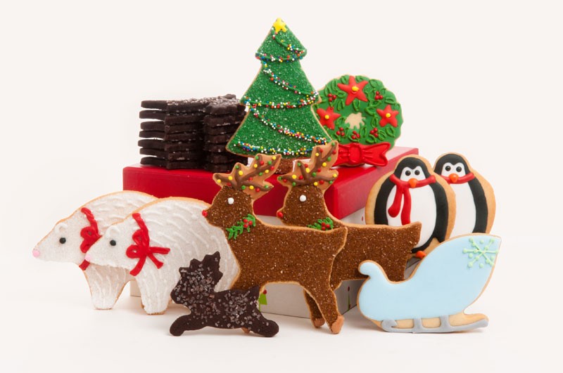 Holiday Party Animals: The menagerie includes hand decorated polar bears, reindeer, penguins, a sleigh, wreath, a holiday tree and eight ginger reindeer. The 17 cookie collection is $48.