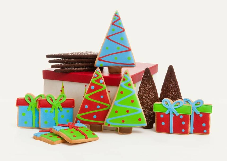 Gift Time: Celebrate the Christmas season with this cookie collection of hand decorated sugar cookies: a tree and presents along with ginger cookie trees. The 15 cookie collection is $45.