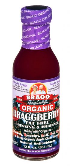 Braggberry: A fat-free dressing with the great taste of berries. Made with purified water and organic ingredients: apple cider vinegar, Concord grape juice concentrate, pomegranate juice concentrate, rice starch, blueberry juice concentrate, red raspberry puree, apple juice concentrate, lemon juice, acai berry puree, goji berry juice, and stevia extract. Each tablespoon has 10 calories and 1.5 grams of sugar.