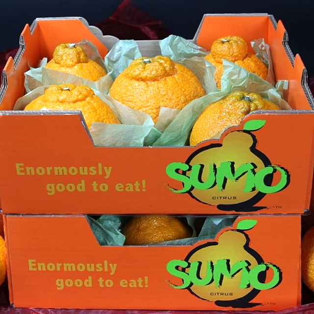 The Sumo Citrus Orange is only in season from February through May – a relatively short four month season. The fruit is hand pruned, picked, and packed to avoid damage and ensure quality. There is no bitterness and very little white membrane, allowing the fruit segments to melt in your mouth. With a low acidity level, the Sumo Citrus Orange is great for those who have trouble with high acid levels of other citrus fruits.