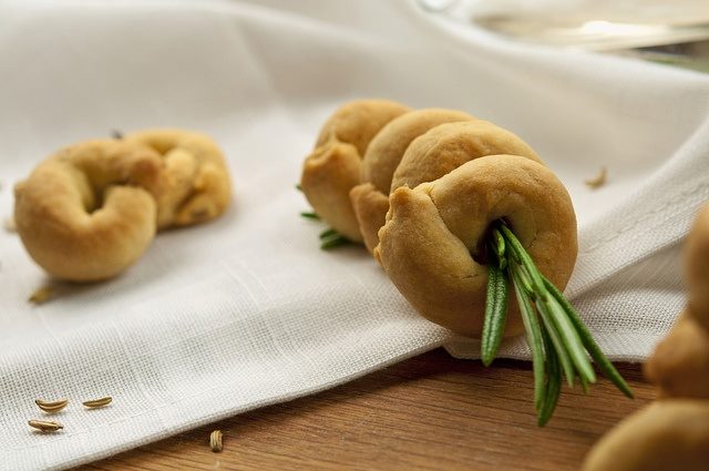 Taralli are round Italian breadsticks, similar in texture to a crumbly cracker with a savory or sweet taste, depending on the ingredients. A delicious, crunchy pretzel-like snack that can be eaten on its own, Taralli are traditionally made with flour, extra virgin olive oil, white wine, yeast, and salt although the savory Italian rings are often flavored with fennel seeds, onion, pepper, sesame seeds, oregano, tomatoes, anchovies or poppy seeds.