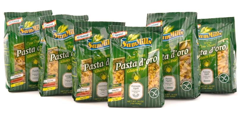 Two friends recently e-mailed me about a product called Sam Mills Pasta d’oro, which one had discovered in an Italian restaurant in New York City when she ordered a gluten-free pasta dish. Expecting a bland pasta, she was pleasantly surprised by the flavorful pasta with a firm texture so she asked the server about the dish and he told her the restaurant uses a gluten-free pasta called Pasta d’oro – a corn pasta made with corn flour and water.