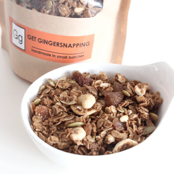 Get Gingersnapping: If a granola was born of gingersnaps, Get Gingersnapping Granola would be the bomb. Organic blackstrap molasses, organic sultana raisins, ginger, allspice, and more make for a savory but subtly sweet granola that is enjoyed all year-long.