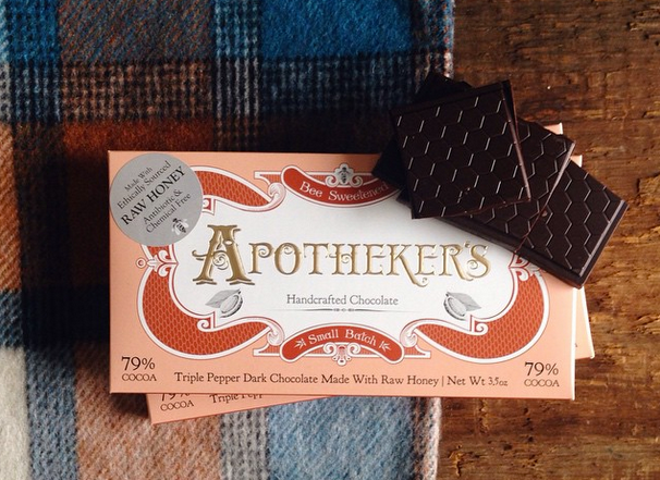 Apotheker’s Kitchen relies on single origin Dominican cacao (directly traded, organic and kosher certified) and raw tupelo honey (from a small apiary that never treats their bees with antibiotics or chemicals) to formulate their chocolate (79% dark) which is then made into bars. The five varieties include: