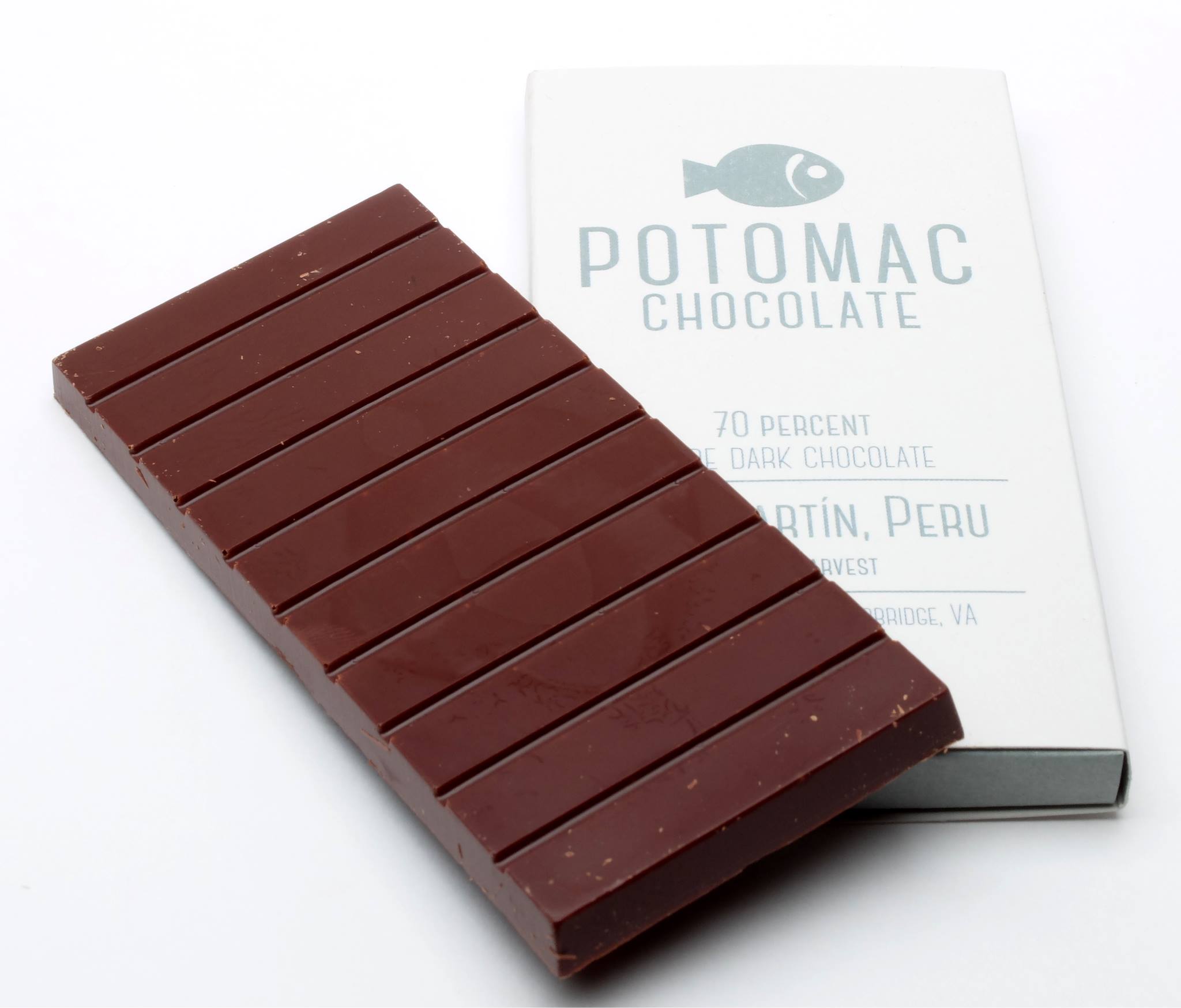 Potomac Chocolate currently offers six bars made with organic cacao beans from three places: Upala, Costa Rica, San Martin, Peru, and Cuyagua, Venezuela. The only ingredient Rasmussen adds is organic cane sugar.