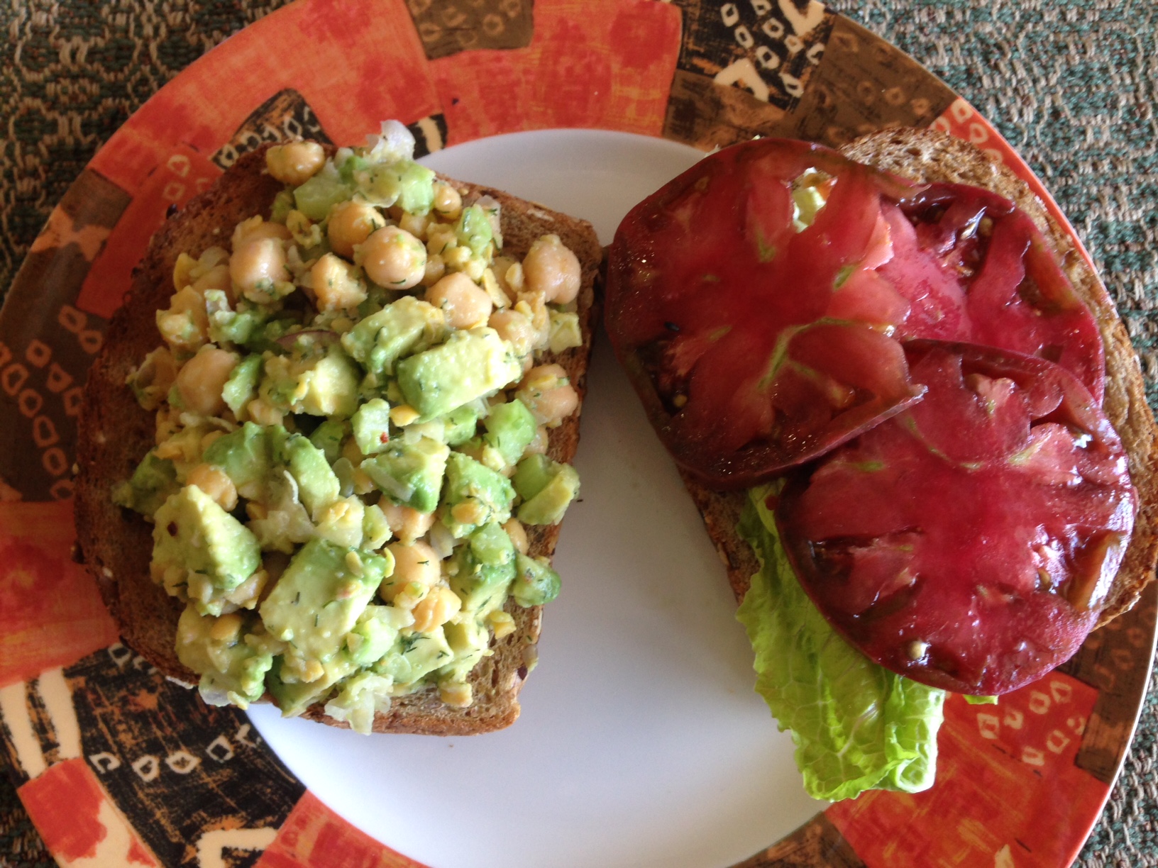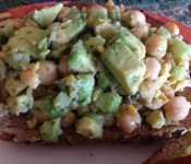 Chick peas are chock full of protein ( 7 grams per half a cup of cooked peas) and although they can taste a bit bland on their own, a squeeze of lemon juice and a sprinkling of salt brings out the flavor of the beans. Add chunks of creamy avocado, crispy apple and celery pieces along with sweet red onion and dill, and a delicious chick pea salad emerges. For those who prefer a less sweet salad, leave out the apple pieces.