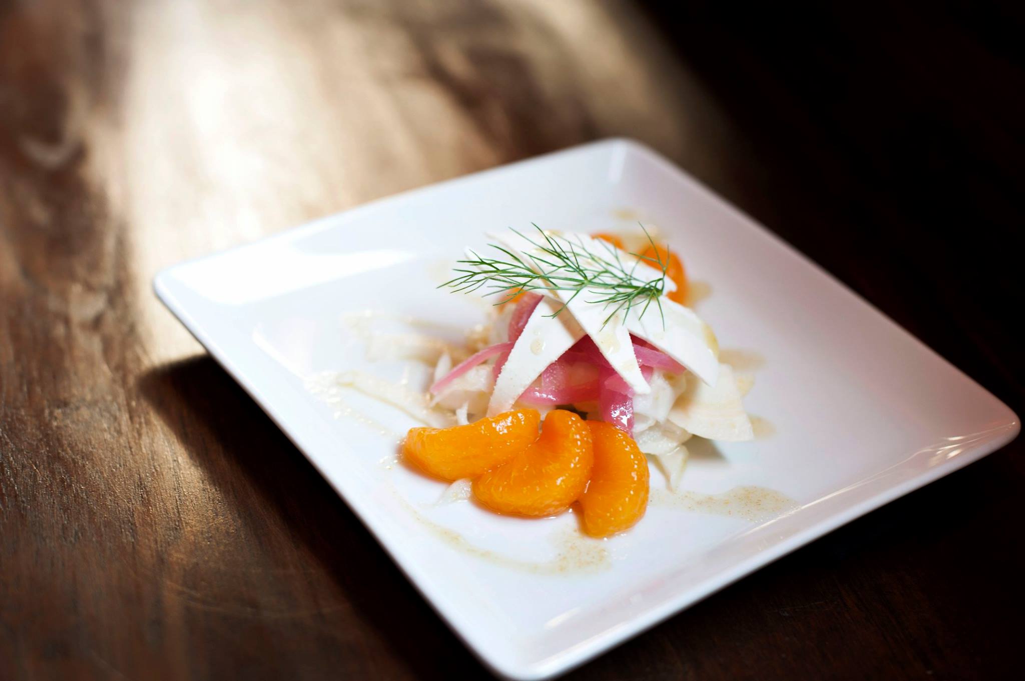 Main courses include a vegetarian entrée with grilled eggplant, brown rice couscous, scallions, and baby carrots in a carrot and vanilla broth, a moist and delicious Sweet Pea and Chipotle Veggie Burger (served with caramelized onions, arugula, and aioli but can be ordered without the aioli), and seasonal desserts including fresh fruit tarts.