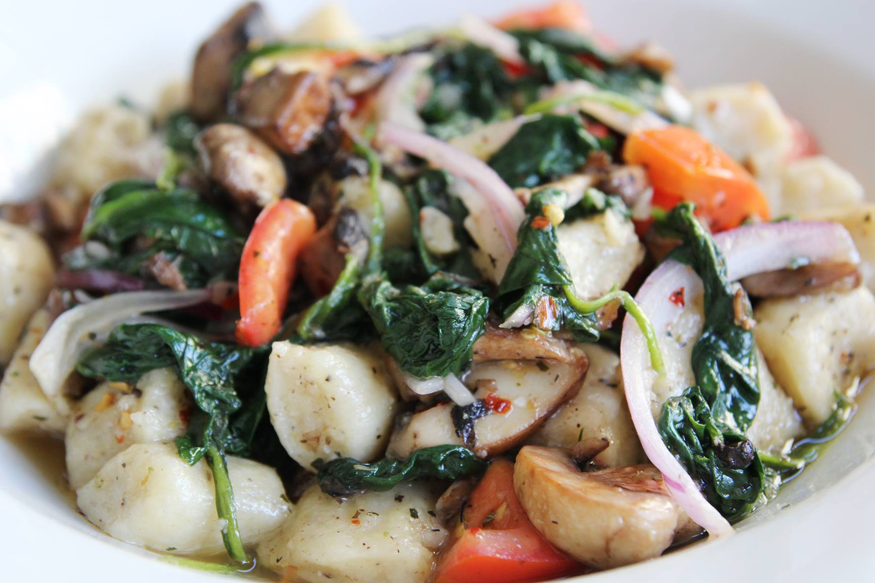 Entrees also include pasta dishes (Tofu Gnocchi tossed with sautéed mushrooms, red onion, tomato, spinach, garlic, basil, shallots and olive oil. and Handmade Ricotta Gnocchi), and coal-fired pizzas (a small has 6 slices and a large has 8 slices) that can be ordered off the menu or choose a Create-Your-Own, where the toppings can be chosen from a wide selection of both traditional and non-traditional items.