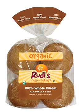 Rudi’s 100% Whole Wheat Burger Buns: Made with organic whole wheat flour, Rudi’s 100% Whole Wheat Buns are also dairy-free (and vegan). Robust with a hint of brown sugar and molasses (but with just 3 grams of sugar per bun), Rudi’s buns are a nutritious and tasty alternative to the standard fare on grocery store shelves. Nutrition-wise, each 65 gram (2.3 ounces) bun has 6 grams of protein, 5 grams of fiber, 1.5 grams of fat, and 240 mg of sodium.