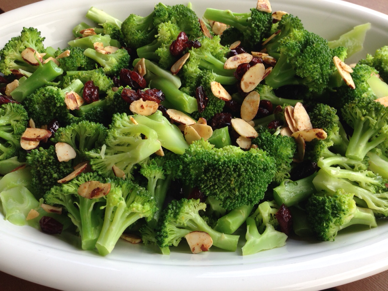Bite-sized green broccoli florets combined with deep red moist dried cranberries, crunchy roasted and seasoned almonds (sliced almonds, maple syrup, cayenne, and sea salt) and a tangy light lemon garlic salad dressing (made with olive oil, lemon juice, mustard, garlic, and sea salt) provide a cornucopia of colors, flavors and textures that bring people back for seconds, and sometimes thirds.