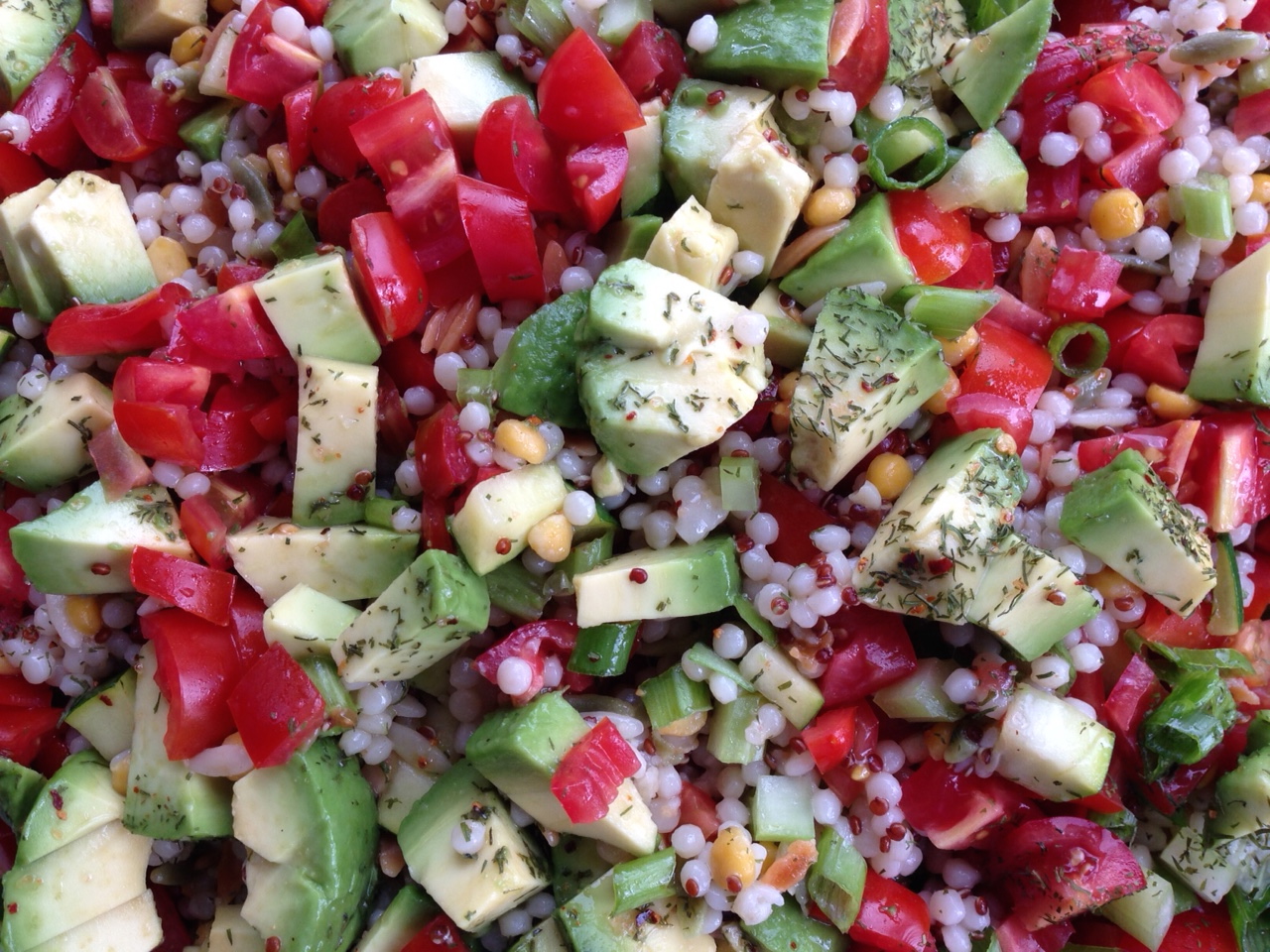 Harvest Grains Blend from Trader Joe’s is a quick cooking blend of couscous, orzo pasta, baby garbanzo beans, and red quinoa. Combined with fresh vegetables, sweet Marzano plum tomatoes, avocado, a bit of olive oil, lemon juice, and dill, the cooked grain blend is the perfect base for a light and refreshing side dish for summertime meals. From stove to table in 20 minutes, the Harvest Grains Summer Salad is a delicious blend of textures and flavors that goes with nearly any dish placed on the table.