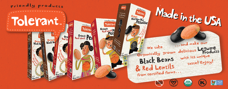Tolerant Foods organic pastas are loaded with protein, fiber, iron, vitamins and minerals, particularly calcium, zinc, folate, thiamine, Riboflavin, and Vitamin B6 – all of which come from the one ingredient in each box – non-GMO organic black beans or red lentils. Nothing else. That’s it.