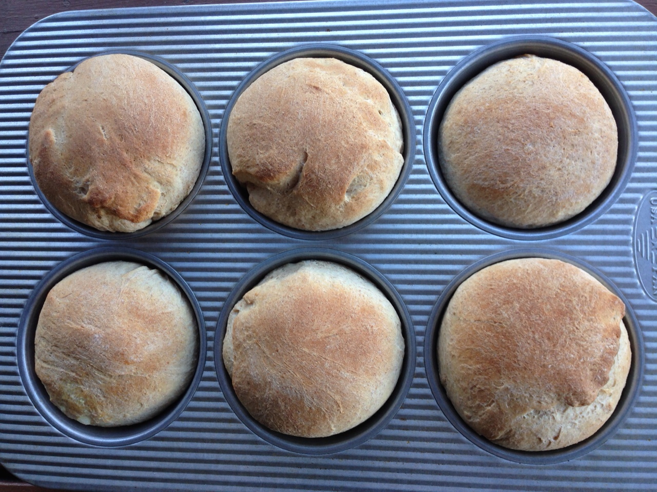 - Punch the dough down and divide (gently tear) the dough into six pieces. Roll each piece into a ball and gently flatten to the size of a hockey puck and place into the burger bun pan. Cover and let rest for 30 minutes.