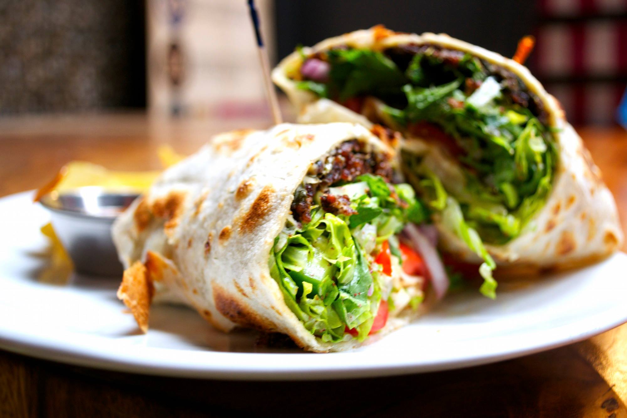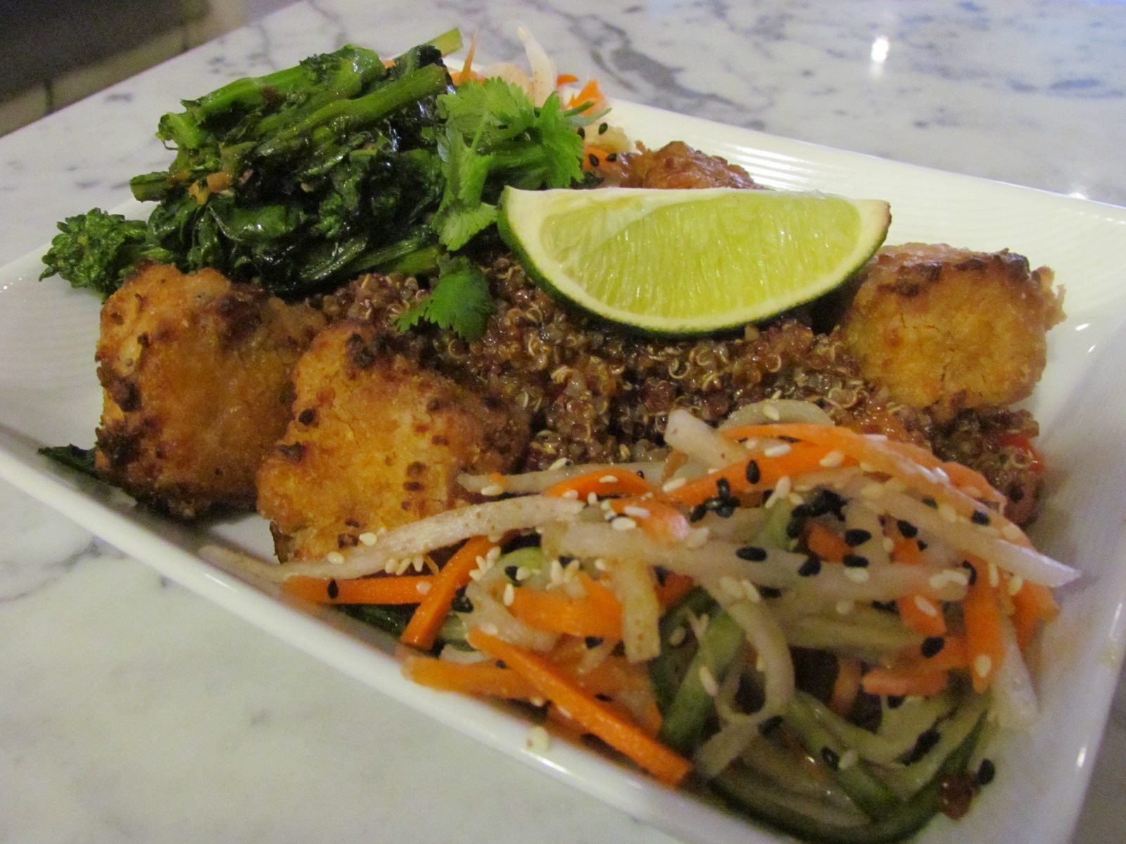 Consider the Black Bean and Quinoa and Fattoush Wrap: a tortilla filled with white bean hummus, quinoa and black bean falafel, fattoush, greens, tomatoes, with a side of crunchy plantain chips and cucumber aioli or the Crispy Tofu Wings served with Korean BBQ sauce or spicy garlic Buffalo sauce along with celery and carrot matchsticks. The Beer Battered Avocado Tacos (soft) are simply delicious.